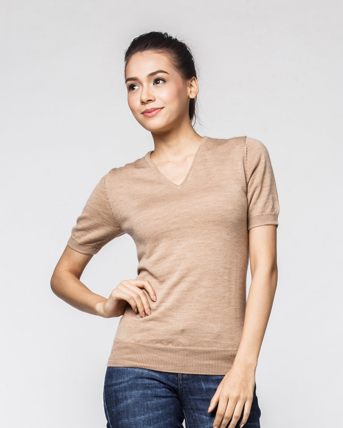 Discover the delightful softness of 19.5 micron merino wool with this ladies' short sleeve v neck.